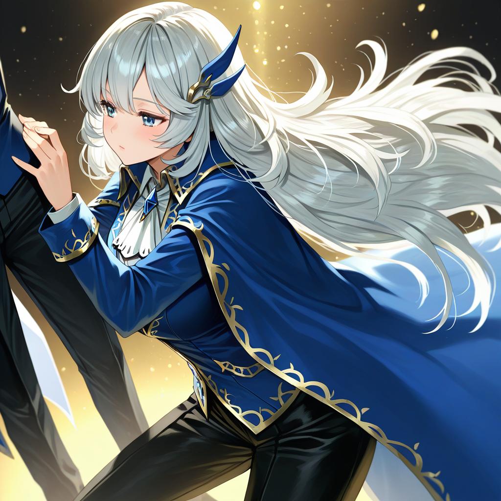 Argalia (project moon), project moon, 1boy, blue eyes, very long hair, white hair, sidelocks, hair ornament, blue cape, blue jacket, collared cape, black pants, long sleeves, gold trim, white ascot, by artist parsley-f, illustrious