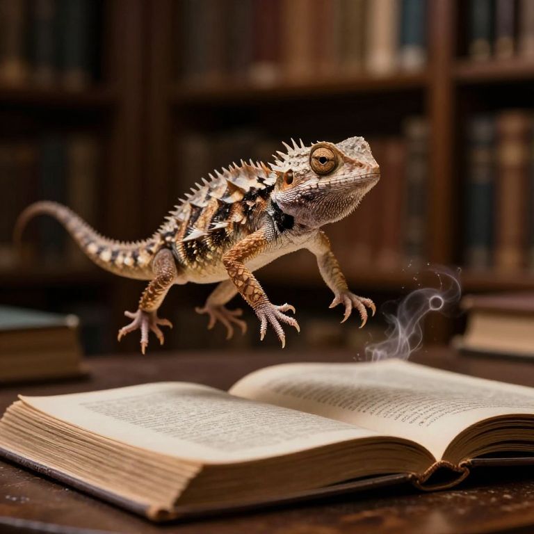 Green dragon-like creature intently reading an open book at a wooden desk surrounded by shelves filled with colorful books in a cozy library setting.