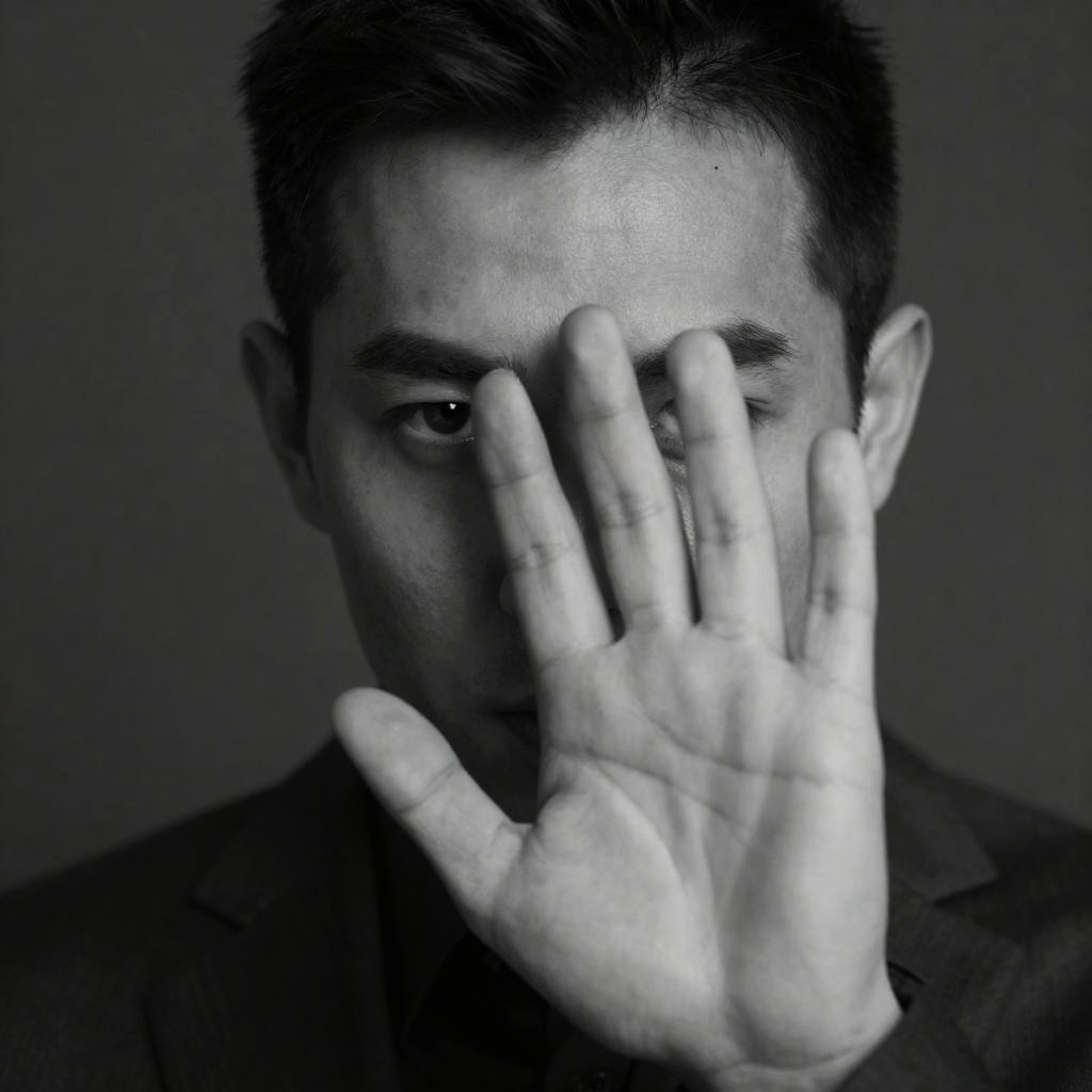 Photograph of a man with blue-tinted skin, intense gaze, right profile, left hand glowing with light, dark background. Man has short, light-colored hair, slightly furrowed brow, focused expression. Light emits from hand, creating sharp contrast.