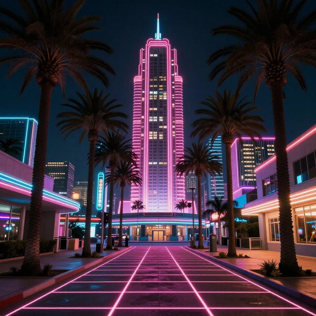 Retro city background at night with neon grids, palm trees lining the avenue, futuristic yet nostalgic, detailed architecture inspired by 80s sci-fi movies, vivid colors and glowing horizon