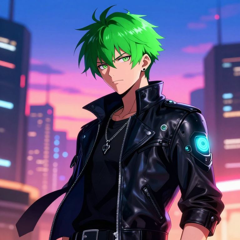 Anime green hair guy with spiky hair, standing in a vibrant futuristic cityscape at dusk, wearing a sleek leather jacket and glowing cybernetic accessories, dramatic lighting highlighting his determined expression, detailed anime style with vivid colors