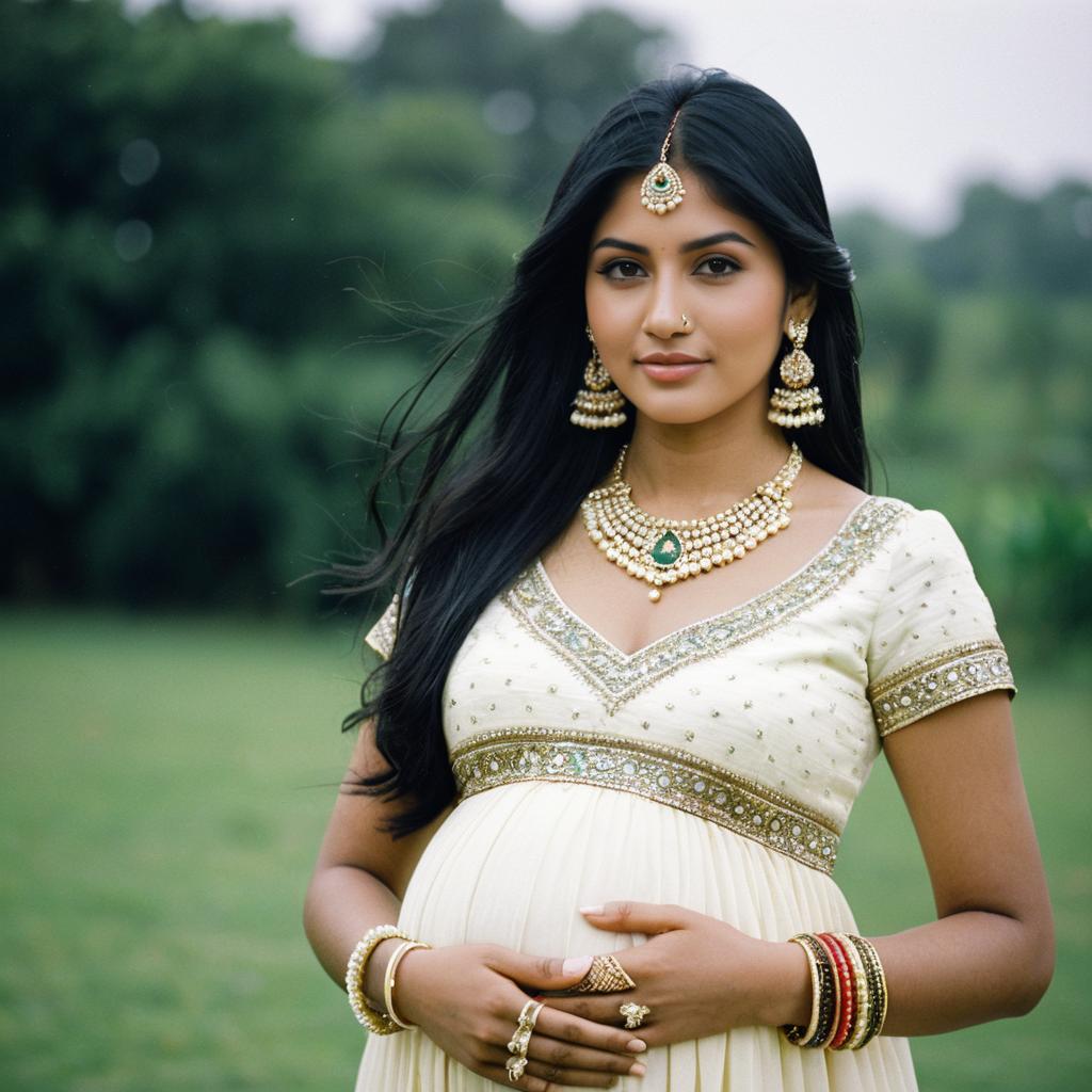 Pregnant Indian woman with long black hair wearing an elegant white and gold embroidered traditional dress. She is adorned with ornate gold jewelry including a necklace, earrings, bangles, rings, and a maang tikka. The photo is taken outdoors with a blurred green natural background.