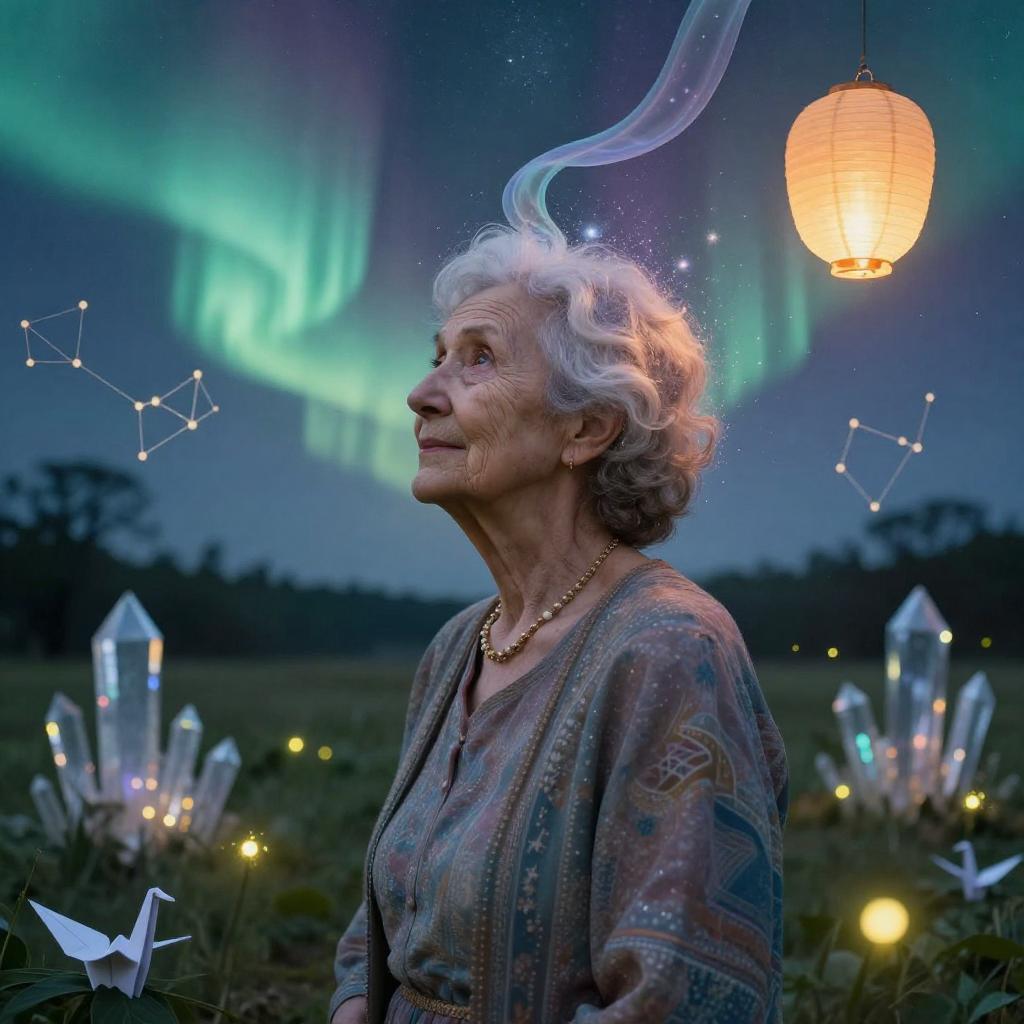 Realistic photo. Double Exposure Elderly woman (oracle)-Dream, aurora ribbons, paper lanterns, origami cranes, constellations, crystal spires, glowing fireflies, whimsical fantasy, expressive creative art, surrealistic concept art, ethereal landscape in a cloud of magic coming out the top of a human head, incredible details, high-quality, flawless composition, masterpiece, highly detailed, photorealistic, 8k sharp focus quality surroundings realistic photo