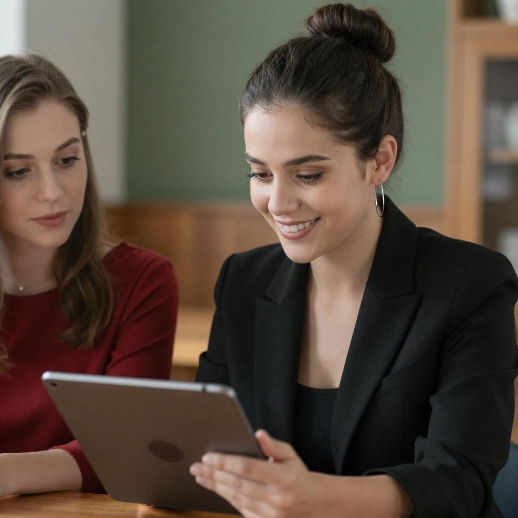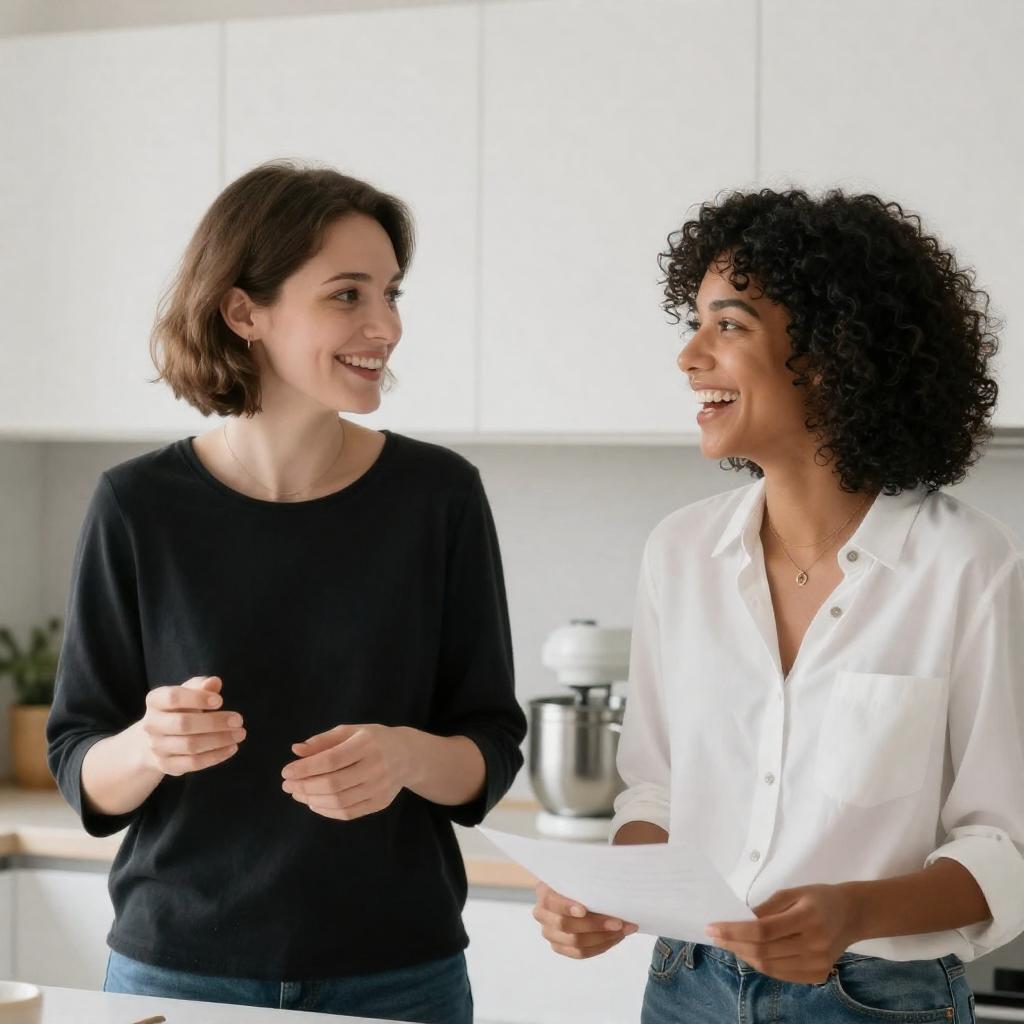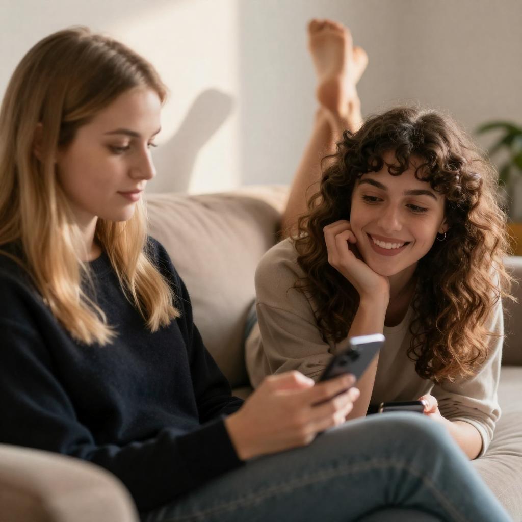 Photograph of two women on a couch. The woman on the left has long blonde hair, wears a dark sweater, and holds a phone. The woman on the right has curly brown hair, smiles, and has her legs up. Warm sunlight illuminates the background.