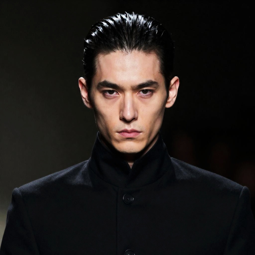 Photograph of a man with pale skin, dark slicked-back hair, intense gaze, and serious expression. He wears a high-collared black jacket. Dark, blurred background. Centered, head-and-shoulders portrait.