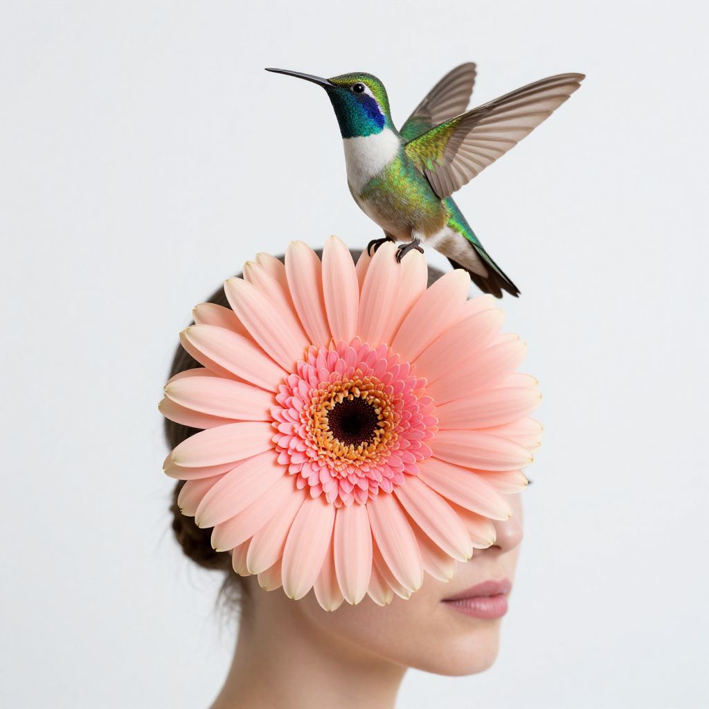 A digitally altered photograph features a vibrant hummingbird with iridescent green and blue feathers perched on top of a large, pink Gerbera daisy with a yellow center. The daisy's petals partially obscure the face of a fair-skinned woman with brown hair, shown in profile. The white background highlights the vivid colors of the hummingbird and flower. The woman's lips are slightly parted, and her expression is neutral. The image combines realistic and surreal elements, emphasizing the contrast between the natural beauty of the bird and flower and the soft, human-like features.