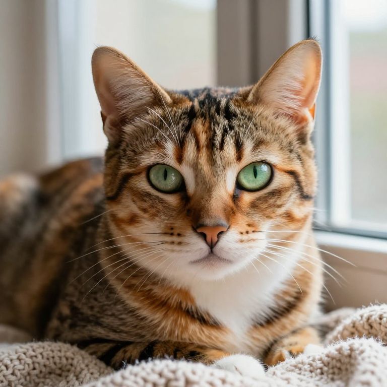 Close-up of a spotted calico cat with striking green eyes, soft textured fur in mottled orange, black, and white spots, resting on a cozy knitted blanket by a warm window, natural daylight highlighting the intricate fur details in a calm indoor scene.