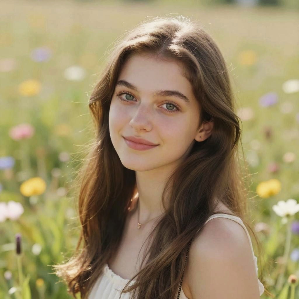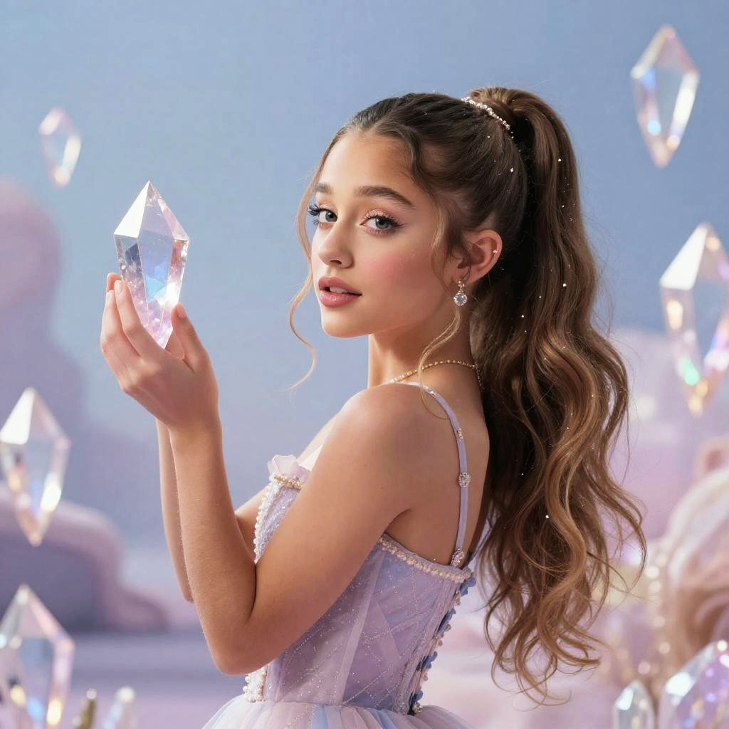 Ariana Grande smiling in a sunny outdoor setting, surrounded by blooming flowers, pastel color palette, dreamy atmosphere, digital painting