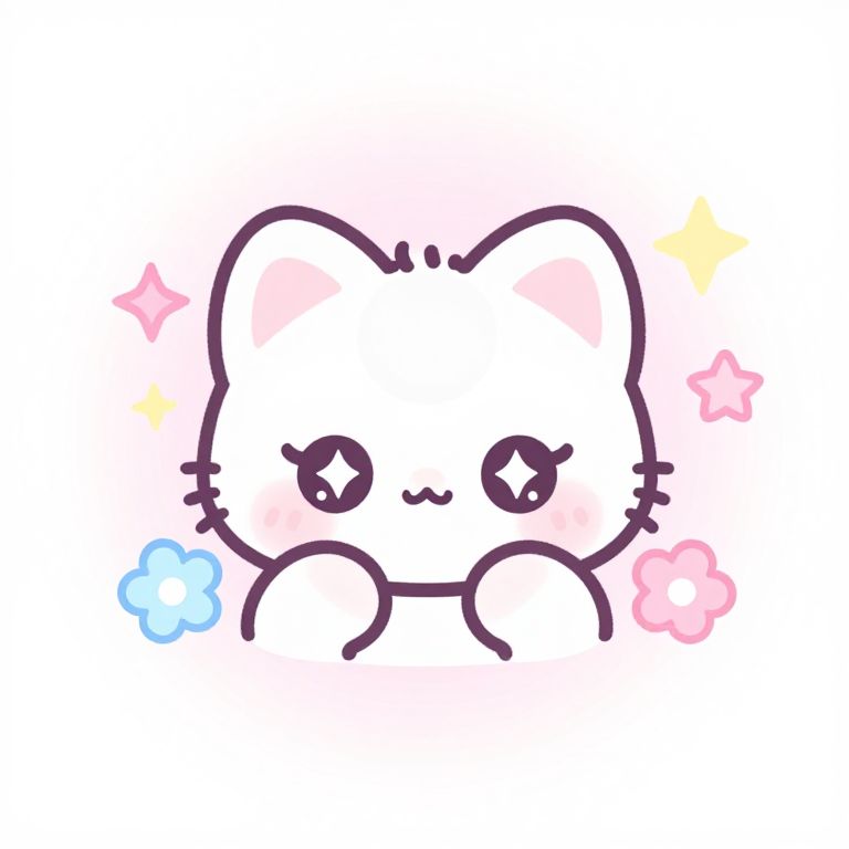 Cute, chibi-style digital drawing of a white cat with black outlines, pink blush, and sparkling eyes, surrounded by pastel flowers and stars