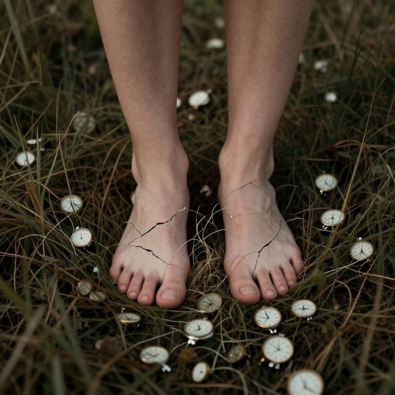 Amidst a scattered field of fractured time, bare feet tread softly, weaving threads of memory and longing, where the echoes of past moments intertwine with the silent promise of what lies ahead.