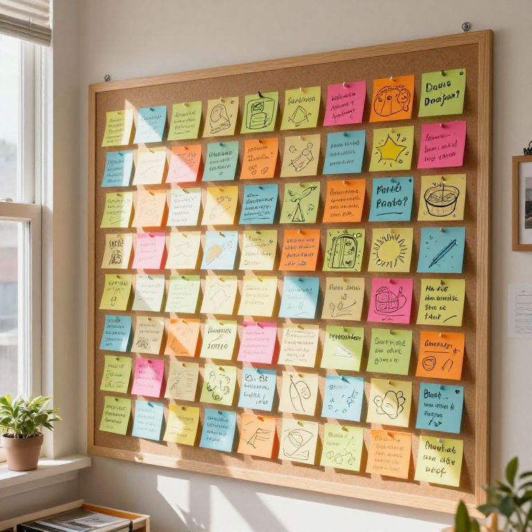 Creative bulletin board covered with 100 drawing prompts sticky notes, vibrant colors and playful doodles surrounding each prompt, cozy room with sunlight streaming through window, inspirational quotes pinned alongside, vibrant and lively atmosphere for continuous creativity
