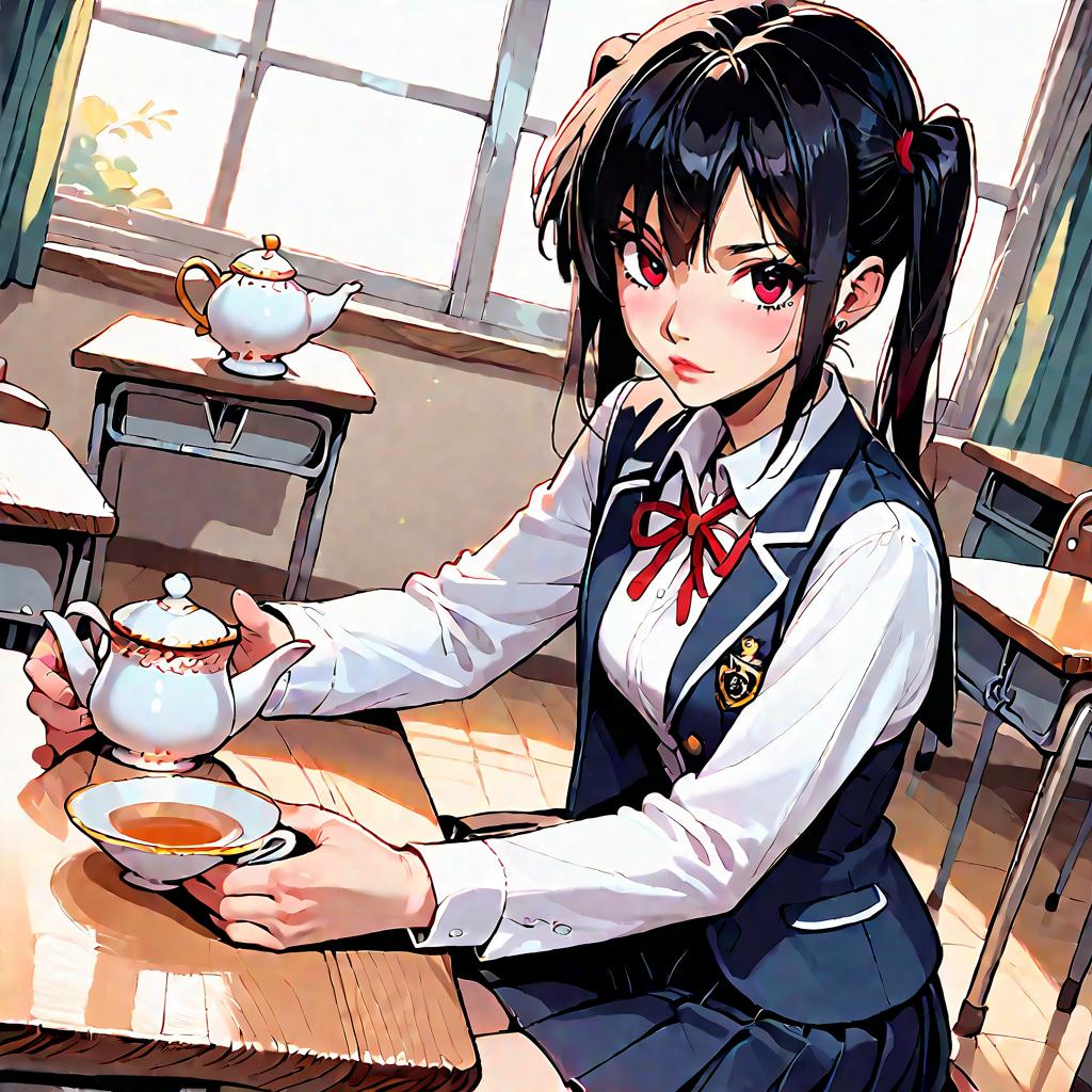 Score_9, score_8_up, score_7_up, source_anime, azusanakano, azusa nakano, black hair, brown eyes, long hair, twintails, sakuragaoka high school uniform, school uniform, uniform, blazer, shirt, white shirt, collared shirt, skirt, pleated skirt, indoors, classroom, sitting, desk, table, tea, teacup, teapot, looking at viewer, cowboy shot, dutch angle, dynamic pose