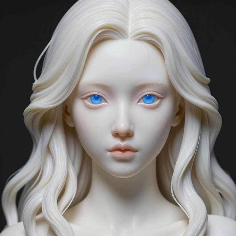 The image depicts a highly detailed, hyper-realistic sculpture of a humanoid figure with a striking and intricate design. The figure's face is smooth and waxy, with large, vibrant blue eyes that stand out against the pale skin. The skin texture is smooth and flawless, with a slight sheen that suggests a glossy finish. The figure's hair is long and flowing, styled in a manner that cascades down its shoulders. The hair is a light, pastel color, adding to the overall ethereal and otherworldly appearance of the sculpture.