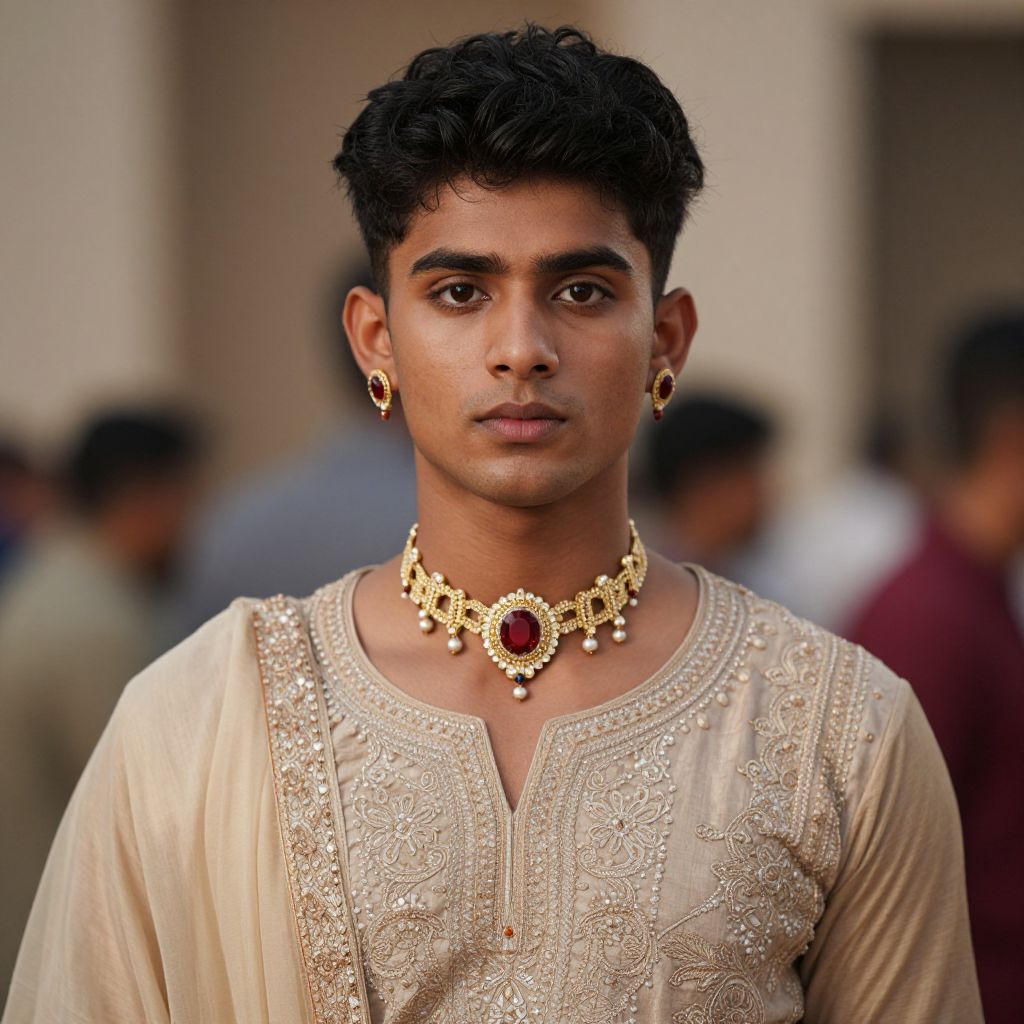 Kalbeliya costume, solo, jewelry, 1boy, male focus, necklace, looking at viewer, blurry, blurry background, upper body, earrings, black hair