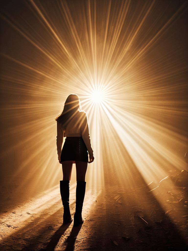 Young woman wearing a solid red, short-sleeve T-shirt dress with an elasticated waistband and knee-length hem standing in front of a strong light source. She is also wearing white low-top sneakers. Radiating beams of light create a dramatic effect on a plain dark background.