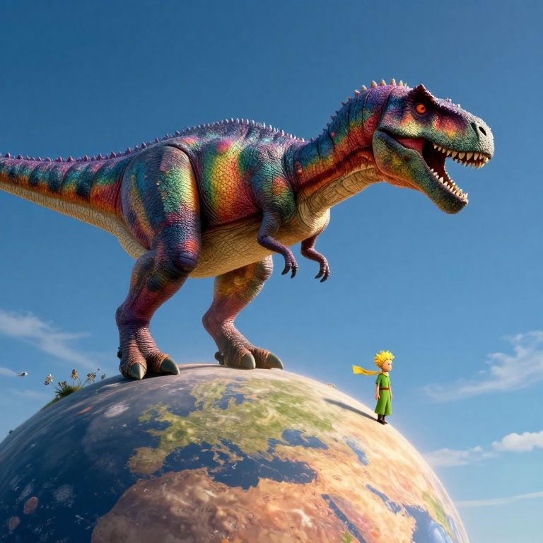 Sound Effects a huge dinosaur with spikes and skin with rainbow colors, on top of a planet as the little Prince, seen from far away,