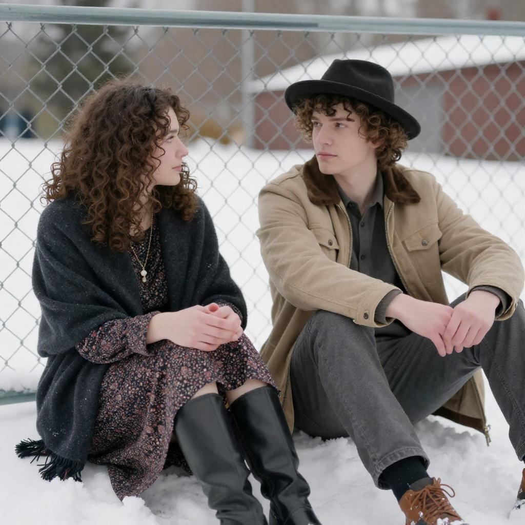 Photograph of a young woman and man sitting on snowy ground against a chain-link fence. The woman has curly brown hair, wears a dark shawl over a patterned dress, and looks at the man. The man has curly brown hair, wears a black hat, beige jacket, and gray pants, looking ahead. Snow covers the ground, and the background is blurred.