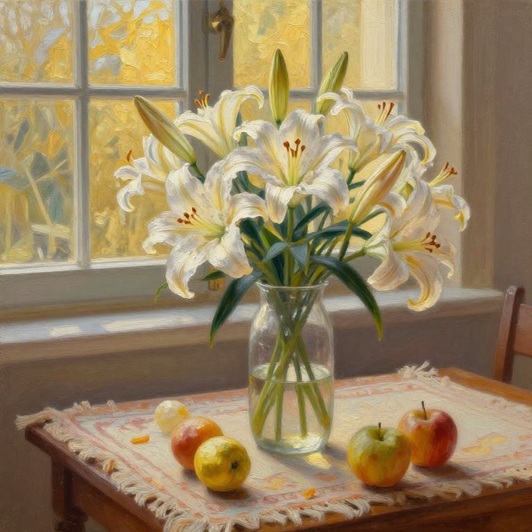 Oil painting style image of a clear glass vase with blooming white lilies on a wooden table covered with a decorative carpet. Various fruits, including apples and lemons, are scattered on the table. Warm golden hour light shines through a window in the background, creating a soft and cozy atmosphere.