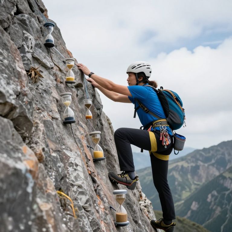 A mountaineer climbs a stairway of suspended hourglasses, each one reversing sand to allow travel through subjective eras.