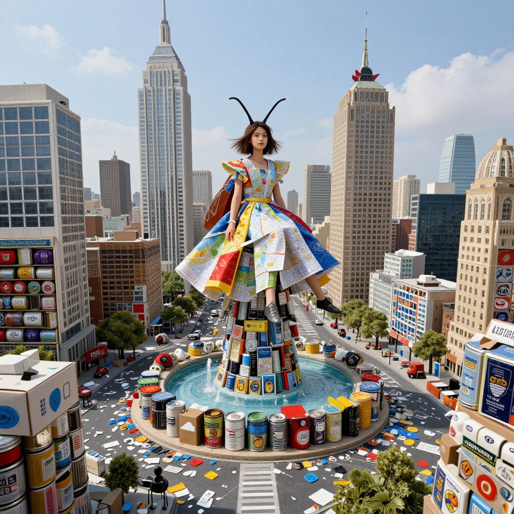 Craft an image in the surrealist collage aesthetic, depicting a cityscape from a bug's perspective, entirely composed of recycled materials. The scene showcases skyscrapers built from stacked cans and boxes, streets paved with interlocking plastic fragments, and a young woman in colorful, flowing attire made from maps and textiles sitting atop a fountain-like structure surrounded by an array of repurposed treasures. This composition harmonizes environmental consciousness with artistic defiance, presenting a visually captivating panorama that redefines beauty and sustainability through the juxtaposition of raw materials and human creativity.