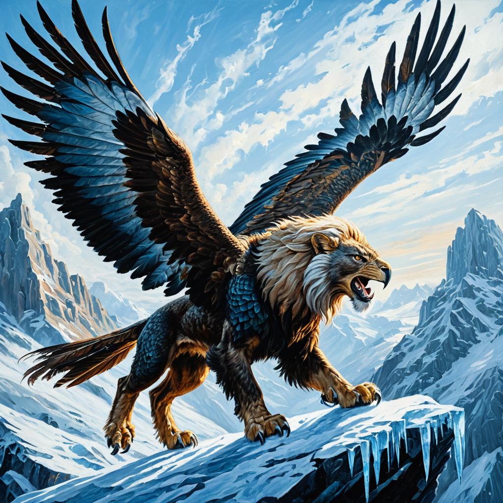 Oil painting in Warhammer fantasy RPG style depicting a majestic griffon with the body of a lion and the head and wings of an eagle. The creature soars through a crisp morning sky above icy blue, snow-covered mountain peaks, rendered in rich and textured silver and blue hues. The griffon features detailed feathers and fur, with fierce expression and golden claws, showcasing fantasy and mythical elements.