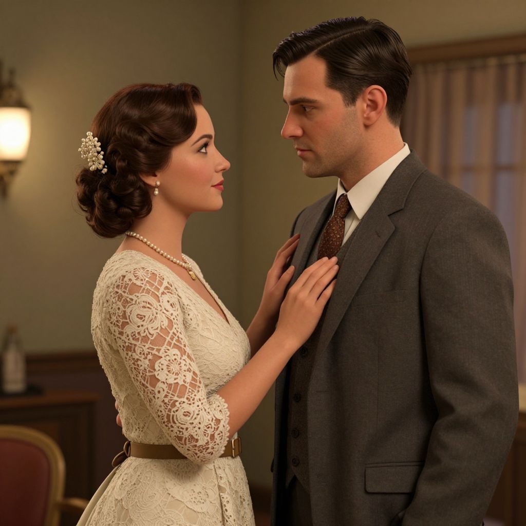 A vintage-inspired, high-definition 3D-rendered scene captures a tender moment between a man in a classic suit and a woman in an elegant lace dress, set against a softly lit, retro-style interior reminiscent of mid-20th-century cinema aesthetics.