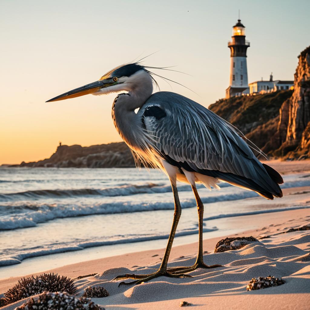 A great blue heron stands gracefully on a white sandy beach with sea waves gently lapping the shore during sunset. In the background, rocky cliffs and a tall lighthouse are visible, creating a serene coastal landscape. The soft warm twilight highlights the heron's detailed feathers and elongated beak, captured in sharp focus with artistic photography.