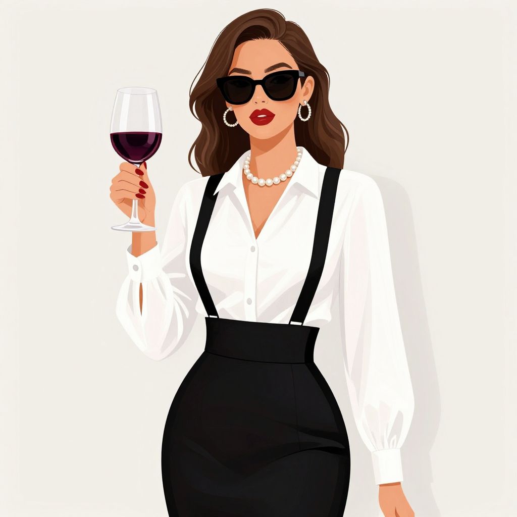 A stylish digital illustration inspired by Canaryko's fashion art, featuring a confident woman in a chic white blouse and black suspender skirt, accessorized with pearls and bold sunglasses, holding a glass of red wine against a minimalist background.