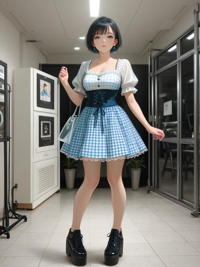 Digital anime-style image of a cute young woman with short black hair, wearing a blue checkered dress, white blouse, black corset, and black