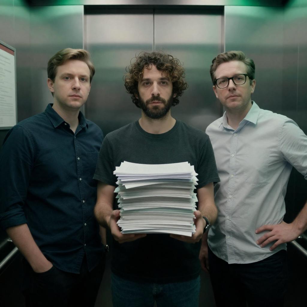Three men in a green-lit elevator. Middle man with curly hair, beard, holding a large stack of white papers. Left man with short hair, dark shirt, hands behind back. Right man with glasses, light shirt, hands on hips.