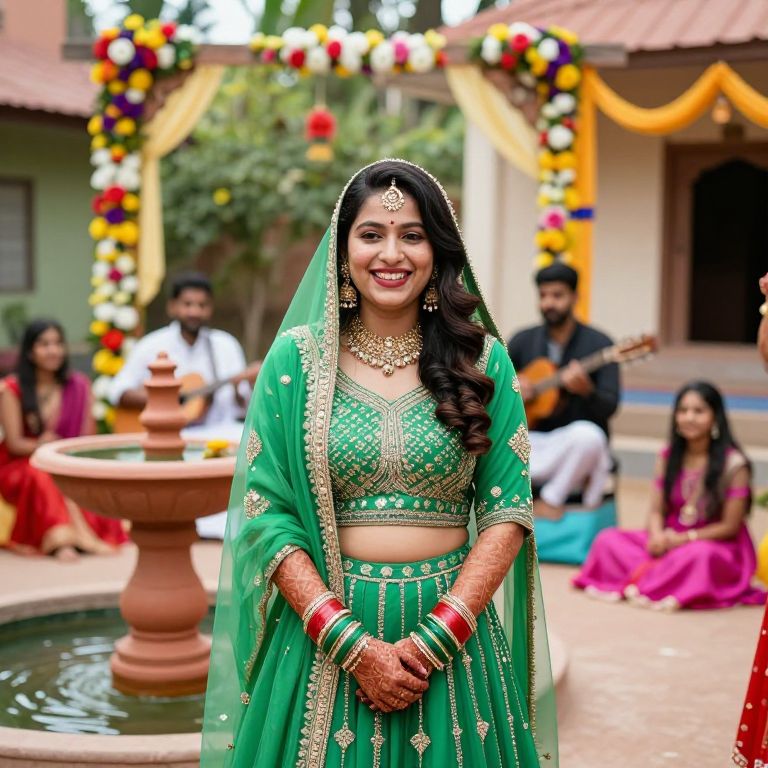 A vibrant, naturalistic image of a young bride in a bright green sharara dress during a wedding celebration in a festive village setting with colorful decorations, local music playing in the background, she is laughing with her cousins, her round face with soft freckles and a bright smile, her dress showing traditional patterns, and the setting includes a clay fountain and a wooden arch covered with floral garlands.