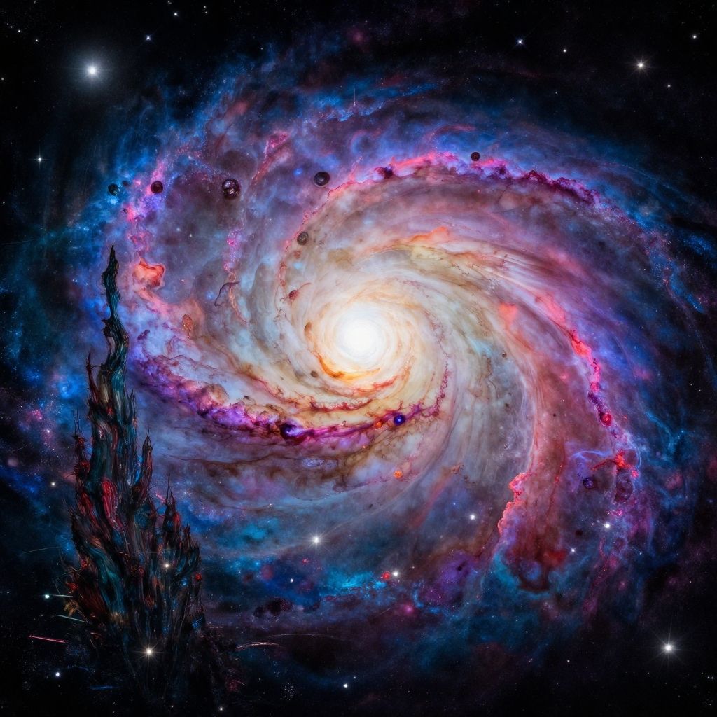 This is a digitally rendered, hyper-realistic image of a swirling spiral galaxy. The galaxy's core is a bright, intense white, surrounded by vibrant, colorful spiral arms in shades of blue, purple, pink, and red. The arms are adorned with numerous small, dark star-like dots and glowing nebulae. In the bottom left corner, a silhouette of a tall, jagged mountain peak is visible against the galaxy. The background is a deep, dark black speckled with distant, tiny white stars, adding depth to the cosmic scene. The image exudes a sense of dynamism and vastness.