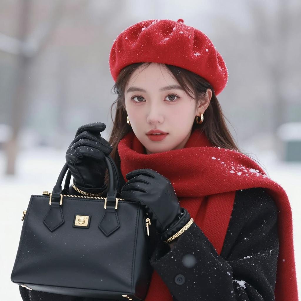 Portrait of a young Asian woman with brown hair and brown eyes wearing a bright red beret and scarf. She is dressed in a beige coat and black leather gloves, holding a black handbag. She has gold hoop earrings and is standing outdoors in a snowy environment with a blurred background.