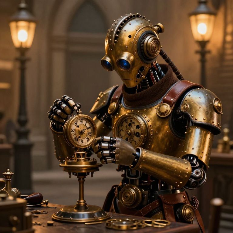 Steampunk robot mechanic repairing clockwork devices, character detailed with rivets and leather straps, Victorian era street background illuminated by gas lamps, warm golden tones
