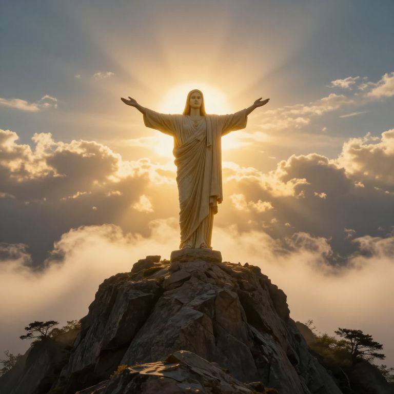Radiant figure stands atop a rocky summit, arms outstretched against a dramatic sky, bathed in golden light as clouds swirl around, symbolizing divine presence and spiritual transcendence.