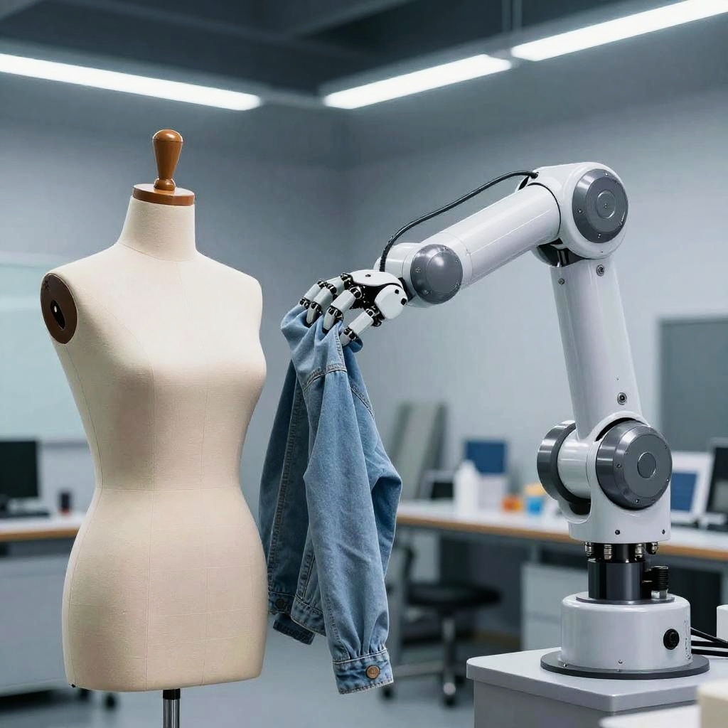 Clothe remover free depicted as a robotic arm gently removing clothes from a mannequin in a well-lit modern workshop, realistic textures, shiny metallic surfaces, meticulous mechanical details, industrial environment with sharp contrasts and subtle shadows.