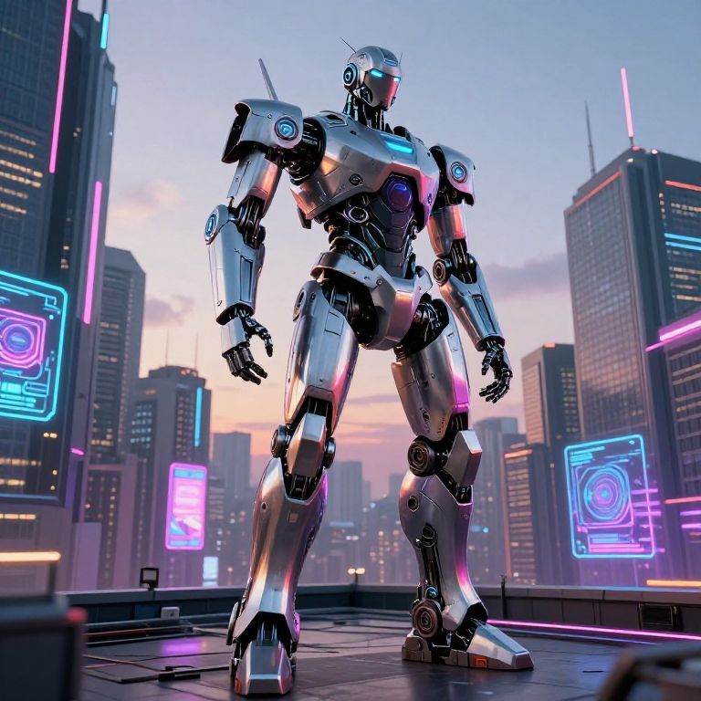 171cm tall majestic humanoid robot standing proudly on a futuristic city rooftop, neon lights reflecting off sleek metallic surfaces, cyberpunk atmosphere with towering skyscrapers and holographic advertisements, dusk setting sky