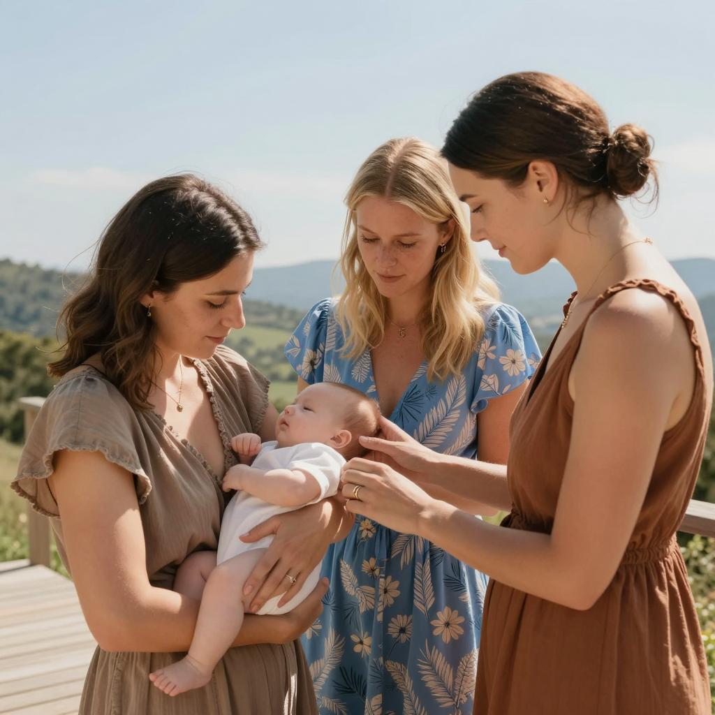 Woman with short, dark hair holds bald baby wrapped in dark cloth. Woman has fair skin, closed eyes, wears light-colored, loose garment. Background has two circular mirrors, wall-mounted light fixture. Light from fixture illuminates upper part of scene. Woman's arms are crossed under baby, holding securely.