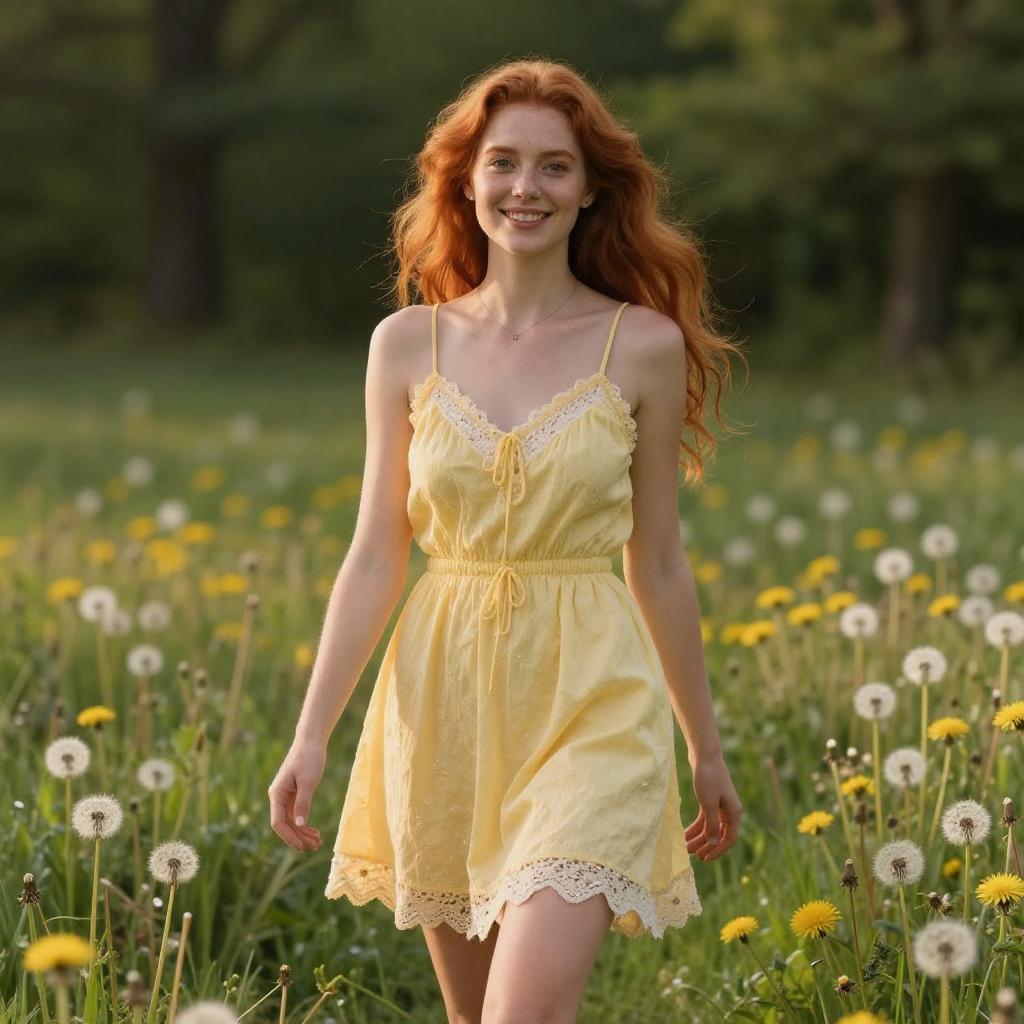 Blonde woman with fair skin, wearing a white sleeveless top, holding a small bouquet of yellow daisies, smiling gently. Sunlight illuminates her hair, standing in a lush green, sunlit forest clearing. Background: blurred trees and grass.