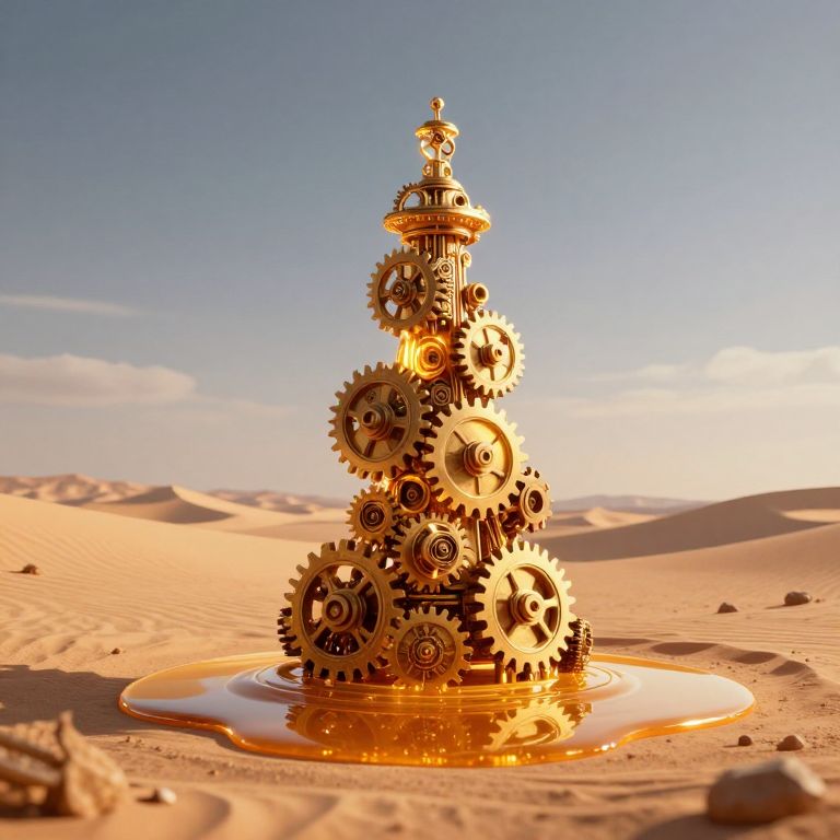 A futuristic 3D-rendered tower composed of intricately interlocking gears glows warmly as it stands atop a pool of liquid honey in a surreal desert landscape, evoking a blend of steampunk and sci-fi aesthetics.