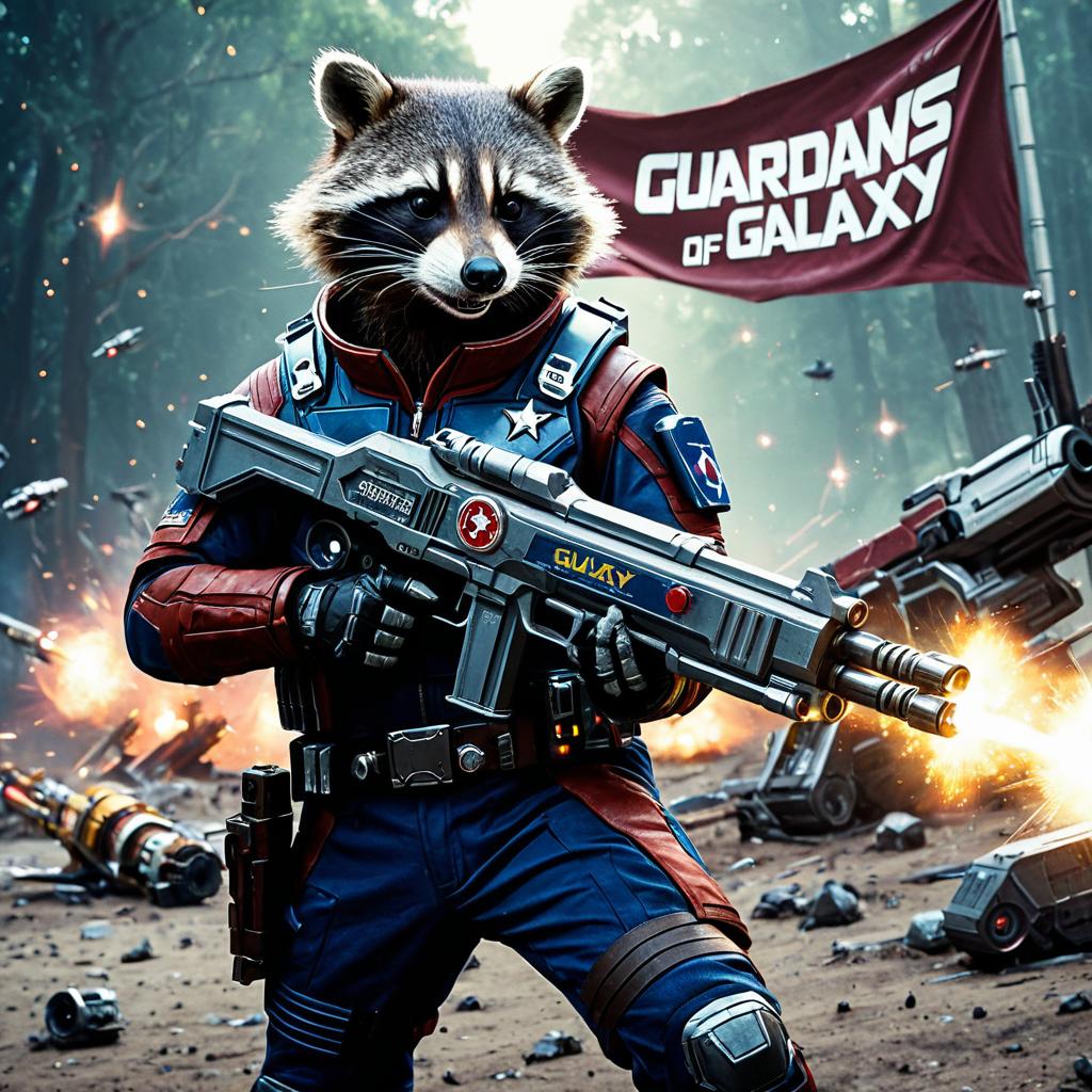 A space marshal raccoon with plasma blaster on a battlefield with a banner that says Guardians of the galaxy.