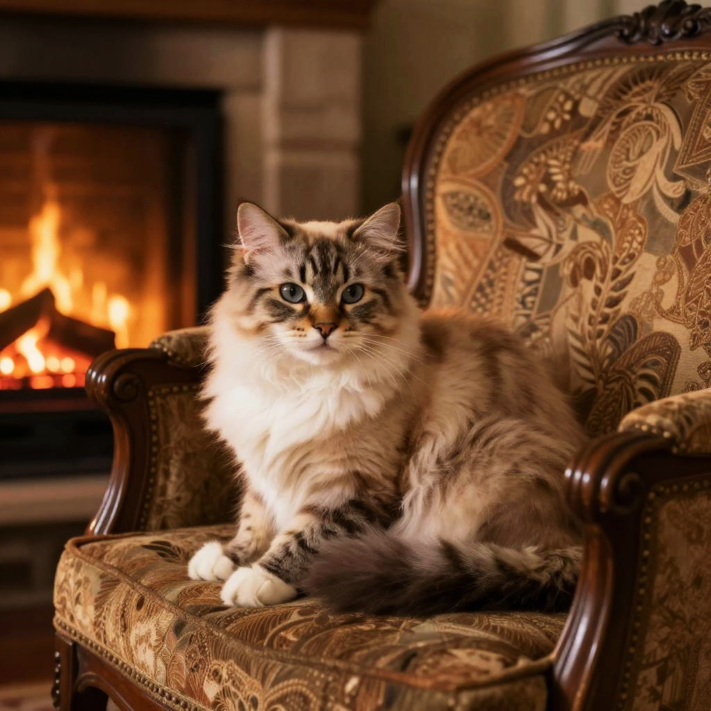 Photograph of a fluffy, long-haired tabby cat with blue eyes sitting on a patterned, antique armchair by a warmly lit fireplace.