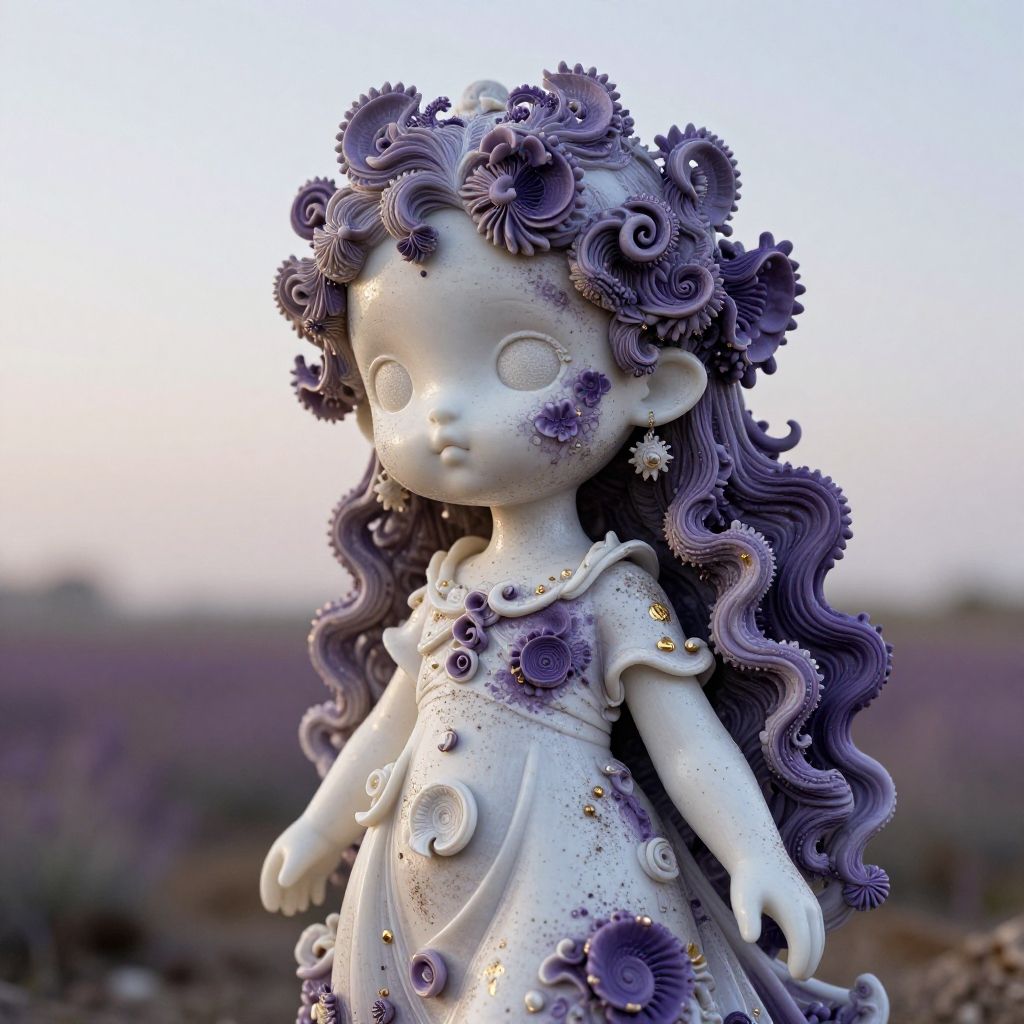 Surface scattered upon sunrise Magical creature adorable girl like hyper realistic woman, golg, white, violet, abstraction, sculpted, shading, porcelain skin, bold, 3D, UHD, multidimensional, deep fractal, rocco etched shapes, skin, dark, gold, close-up, dirt particles, long curly dress 8k award winning