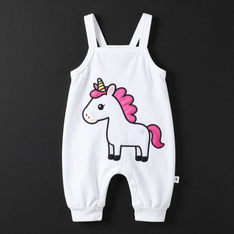 Photograph of a white, sleeveless onesie with a black background, featuring a cute, cartoon-style unicorn graphic in the center. The unicorn has a pink mane and tail, a small yellow horn, and black eyes and hooves. The onesie has a simple, smooth texture and is laid flat against the dark background, highlighting its minimalistic and playful design. The unicorn graphic is centrally positioned, with the onesie's armholes and leg openings clearly visible.