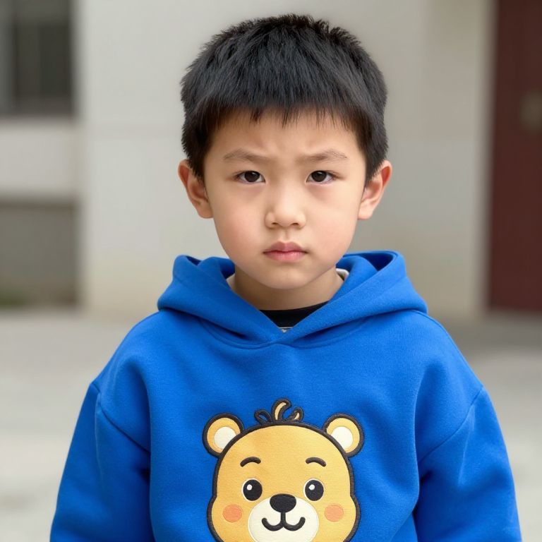 A young boy is wearing a blue hoodie with a cartoon character on the hoodie. The boy has a serious expression on his face.