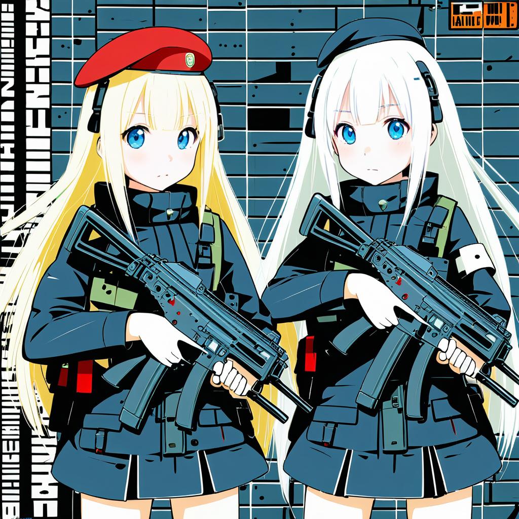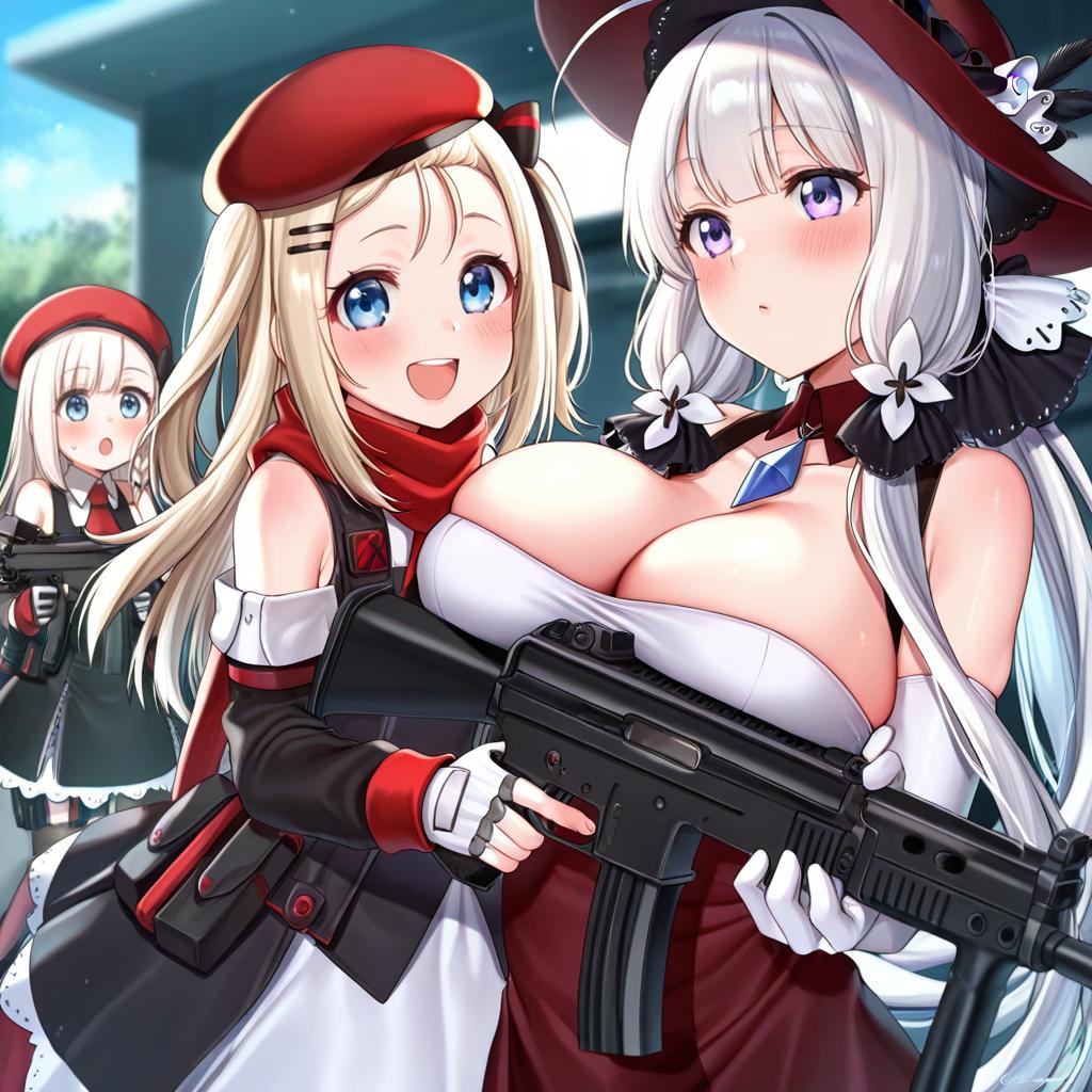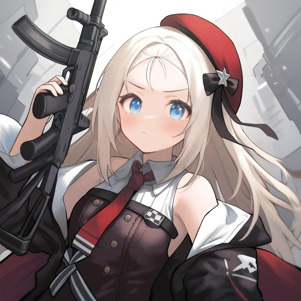 Mp5 (girls' frontline), girls' frontline, 1girl, blue eyes, long hair, white hair, blonde hair, red headwear, submachine gun, beret, h&k mp5, by artist ogawa shou, anime