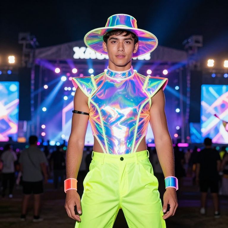 A handsome guy with facial features defined by a strong nose and smooth cheekbones, wearing a unique rave outfit consisting of a holographic body suit with shifting colors, a wide-brimmed headpiece with neon glow, and matching high-visibility pants, standing in front of a large concert stage during a major electronic music festival with a dynamic light show behind him.