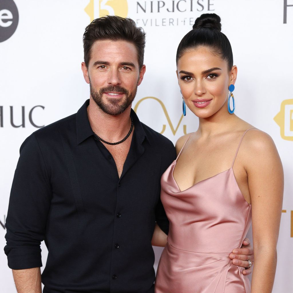 Photograph of a couple at a formal event. The man, with a trimmed beard, dark hair, and wearing a black button-up shirt with the top button undone, stands on the left. The woman, with dark hair in a high bun, wears a silky, pink spaghetti-strap dress and large blue hoop earrings. She stands on the right with her hand on the man's waist. Both are smiling. The background features a white step-and-repeat banner with various logos in black and gold. The image has a bright, well-lit appearance.