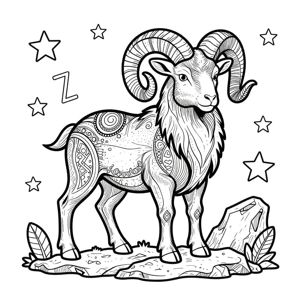 Aries coloring pages featuring a bold ram with curled horns standing on rocky terrain, surrounded by stars and zodiac symbols, intricate line art style perfect for coloring, detailed patterns and flowing lines to inspire creativity and focus.