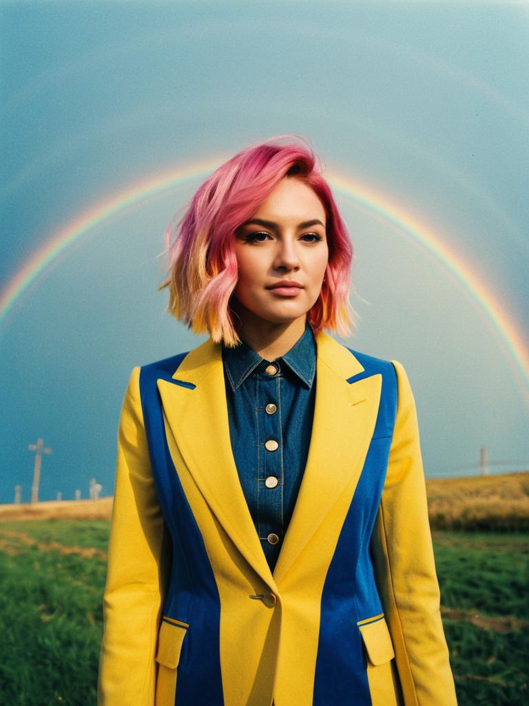 Yellow Rainbow, woman in a gold suit with pink hair and a blue and yellow jacket